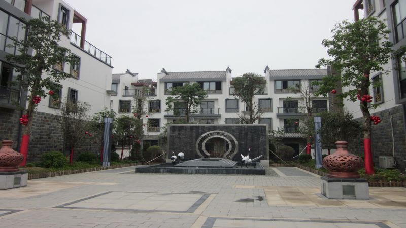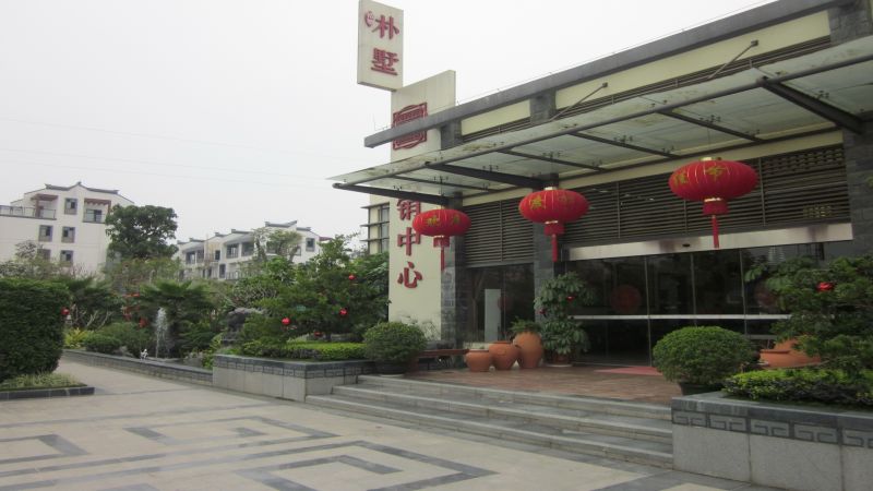 入口大門雄偉、簡約,主要以鋼結構施工,粉墻黛瓦的色彩基調,廊腰縵回的線條布局如同中國水墨畫,翠竹婆娑,聽疊級水景潺潺有聲,看鏤空景墻、山水照壁、修竹茂林,在園區景觀施工完工下,無不深蘊著中國傳統文化內涵和親切的東方韻致。